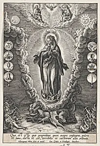 Welcome to the Metropolitan Museum of Art's Drawings and Prints department, where you'll find *The Virgin with the Symbols of the Lauretanian Lit*, an exquisite engraving by Hieronymus Wier, a prolific Flemish artist active circa 1573–1619. Part of Antwerp's renowned Wierix family of engravers, Hieronymus specialized in intricate religious imagery during the Counter-Reformation era when Catholic devotion was vividly expressed through printmaking to reach wide audiences. This second state of two depicts the Virgin Mary surrounded by symbols from the Litany of Loreto (or Lauretanian Litany), a ...