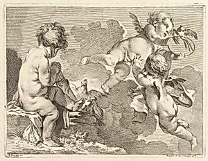 Three Loves, one of which is seated, holding a quiver