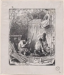Three men at work by fire by Jacques-Adrien Lavieille|Charles Jacque