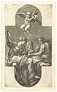 Three Muses and a Putto with Cymbals, a cruciform composition, from a series of eight compositions after Francesco Primaticcio's designs for the ceiling of the Gallery of Ulysses (destroyed 1738-39) at Fontainebleau