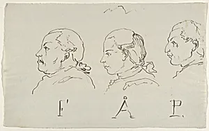 Carl August Ehrensvärd a Swedish nobleman, naval officer, and amateur artist (1745–1800), *Three Portraits in Profile sometime between 1765 and 1800. This intimate drawing, executed in pen and brown ink over black on a modest sheet measuring 8⅛ × 13 inches, captures three male figures in sharp profile view. Housed in the Metropolitan Museum of Art's Drawings and Prints department, it exemplifies the refined draftsmanship of late 18th-century Europe. The profile format evokes classical antiquity—think Roman coins and cameos—popular during the Enlightenment for their noble simplicity and silhou...