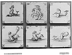 This charming 5 x 5-inch square tile, crafted in tin-glazed earthenware around 1640–60 by an unknown Dutch artist, captures the whimsical spirit of the Dutch Golden Age. Adorned with vivid scenes of men, mermaids, and horses, it exemplifies the decorative ceramics popular in prosperous Dutch households. These small-scale wonders were often used to embellish fireplaces, hearths, and walls, everyday spaces into lively tapestries of imagination. The tin-glaze technique, a hallmark of Dutch Delftware, involved coating earthenware with a tin-oxide mixture to create an opaque white surface ideal for bold painted colors that wouldn't fade under heat or smoke. This innovation made tiles affordable and mass-producible, democratizing art for the middle class during the Netherlands' era of trade and cultural flourishing. Mythical mermaids evoke maritime folklore central to Dutch seafaring identity, while human and equine figures add narrative energy, perhaps hinting at adventure or allegory. Today, housed in the Metropolitan Museum of Art's European Sculpture and Decorative Arts Department (gift of W. R. Valentiner, 1908), this tile offers a window into 17th-century domestic life—practical yet fantastical, blending utility with artistry.
