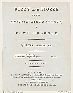 Title Page, from Bozzy and Piozzi by Peter Pindar, Esq.