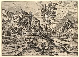 **Tobit from *Landscapes with Biblical andological Scenes*** Hieronymus Cock, a leading Antwerp printmaker of the 16th century created this etching in 1558 as part of his innovative series blending biblical narratives with expansive landscapes. Cock, often called the "father of Netherlandish landscape etching," ran the influential publishing house At the Four Windmills, detailed prints that elevated landscape as a central artistic element rather than mere backdrop. This work draws from the Book of Tobit in the Apocrypha, featuring scene with men amid hills, trees, buildings, and sweeping vis...