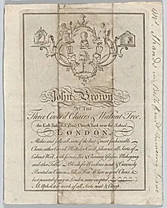 Trade card of John Brown, Chairs and Cabinet-work, at the Three Cover'd Chairs & Walnut Tree, St. Paul's Church Yard, London