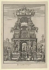 This etching by François Chauveau captures grand triumphal arch erected in Paris to honor Cardinal Jules Mazarin, the chief minister under young King Louis XIV, following the landmark Treaty of the Pyrene in 1659. That treaty ended decades of Franco-Spanish, securing French territorial gains and marking a pinnacle of Mazarin's diplomatic triumphs. Created around 1664–65, the print commemorates the lavish public celebrations—fêtes—with architectural splendor, including monuments, coats of arms, figures of men, and symbolic birds, evoking the era's Baroque exuberance and royal propaganda. Chauv...