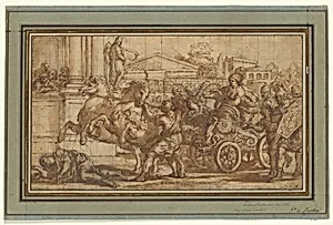 In the turbulent world of ancient Roman history, as recounted by Livy, Tullia the Younger—daughter of King Servius Tullius— the shocking act of driving her chariot her father's lifeless body to reach her husband, the usurper Tarquin. This dramatic drawing by Ciro Ferri, a prominent Italian Baroque artist active in Rome (ca. 1655–70), captures that infamous moment with visceral intensity. Ferri, pupil of Pietro da Cort, infused his works with the Baroque penchant for theatrical emotion, dynamic movement, and moral complexity, turning classical tales into visually arresting spectacles. Executed...