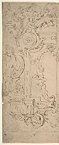Two Alternatives Designs for a Cartouche Decorated with a Frame, Statues, and Volutes.