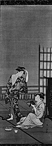 Torii Kiyonaga's *Two Beauties after the Bath* (18th century) is a captivating hanging scroll from Japan's Edo period (16151868), executed in ink and color on silk. Measuring nearly 40 inches tall, this intimate vertical format was designed for private contemplation, often unrolled in a serene domestic setting. The work belongs to the ukiyo-e tradition—"pictures of the floating world"—celebrating the fleeting pleasures of urban life in Edo (modern Tokyo). Kiyonaga, a leading figure in the Torii school, mastered bijin-ga, or images of beautiful women, with his signature elegance and realism. H...