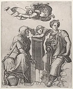 Two female figures seated in the clouds flanking an angel and another flying above carrying a banderole