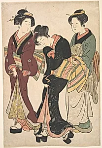 In the vibrant world of Edo Japan (1615–1868), Kitao Shigem's *Two Geishas and a Maid* (ca. 1790) captures the elegance of the "floating world" (ukiyo-e), a cultural sphere of entertainment districts like Yoshiwara in Edo (modern Tokyo). Shigemasa, a masterkiyo-e printmaker and illustrator trained under Suzuki Harunobu specialized in bijin-ga—depictions of beautiful women—blending delicate realism with stylized grace. This woodblock print, rendered in ink and vibrant colors on paper, exemplifies the medium's revolutionary role: affordable multiples made sophisticated art accessible beyond the ...