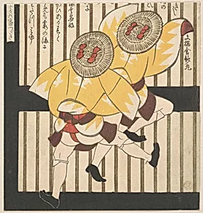 Two Men Wearing Yellow Coats and Straw Hats with Red Bows