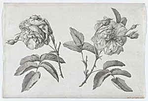 Anne Vallayer-Coster's *Two Roses* (ca. 1810) is a delicate study in pen and gray ink, brush and gray wash over black chalk, measuring just 8¼ x 13⅜ inches. Created late in the artist's career, this drawing captures the subtle beauty of two roses with her signature precision, highlighting petals, stems, and leaves in nuanced shades of gray. Housed in the Metropolitan Museum of Art's Drawings and Prints department, it reflects Vallayer-Coster's mastery monochrome techniques, which allowed her to emphasize form, texture, and light without the distraction of color. A leading French still-life pa...