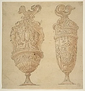 Behold *Two Urns Decorated with Human Figures, Animals andlands*, a captivating preparatory drawing by the Renaissance Mannerist Polidoro da Caravaggioc. 1499–1543). Created in pen and brown ink with brush and brown-gray wash, heightened with white gouache over faint graphite traces, this nearly square sheet (9 3/4 x 9 3/16 in.) showcases two ornate urns brimming with dynamic motifs—graceful human figures, lively animals, and flowing garlands. Polidoro, a pupil of Raphael who later adorned Rome's Palazzo Milesi with innovative facade frescoes in the grotesque style, excelled in such ornamental...