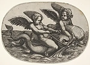 In this enchanting oval engraving, *Two Winged Putti Riding Parallel Dolphins Above the Water Surface created around 1550–87, visitors encounter the whimsical interplay of Adamo Ghisi Scult, a masterful Italian engraver, and Giulio, the influential Mannerist painter and architect. Scultori's precise burin work reproduces Romano's dynamic design, capturing two cherubic putti—those joyful, winged infants emblematic of Renaissance playfulness—frolicking astride dolphins just skimming the waves. The oval format adds a sense of intimate, jewel-like elegance, perfect for decorative frames or collect...