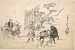 Behold *Two Young Samurai*, a captivating woodblock print by Hishikawa Moronobu (1618–1694), created around 1680 during Japan's Edo period (16151868). Moronobu, one of the earliest masters of ukiyo-e "pictures of the floating world"—ioneered the single-sheet color print, capturing the vibrancy of everyday life, theater, and warrior culture in a time of relative peace under the Tokug shogunate. This intimate work (10 1/8 x 15 1/5 in.) depicts two youthful samurai amid horses and trees, evoking the elegance and discipline of the samurai class, symbols of loyalty and martial prowess. Printed wit...