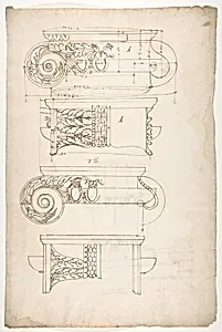 Unidentified, Ionic capitals, two front and side elevations (recto) Doric impost, elevation of entablature (verso)