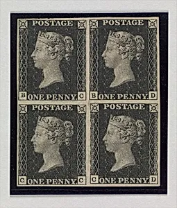 Unused block of four "Penny Black" postage stamps of Queen Victoria