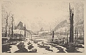 Behold the dramatic *Valley of Desolation*1910), a masterful lithograph by American artist Joseph Pennell (7–1926). Part of the esteemed Rosenwald Collection in the National Gallery of Art Department of Prints (CG-W), this work captures Pennell's signature flair for bold, atmospheric landscapes. Lithography, the medium here, was a revolutionary 19th-century technique Pennell elevated to fine art: artists drew directly on limestone with greasy crayons, allowing for rich tonal gradations and intricate details that mimicked drawing while enabling multiple impressions. Pennell, a leading figure in early 20th-century American printmaking, was renowned for his vigorous black-and-white depictions of natural wonders and urban scenes, often infused with a sense of grandeur and desolation. Created amid the Progressive Era's fascination with exploration and industrialization, this print reflects his travels and keen eye for stark, evocative terrain—evoking isolation and sublime beauty through masterful contrasts of light and shadow. As a classified print, *Valley of Desolation* highlights lithography's role in democratizing art, bridging elite collecting with wider audiences. Pennell's technical prowess made his works collector favorites, and this piece endures as a testament to the power of print to transport viewers to remote, haunting vistas.