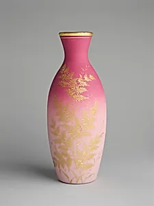 This delicate vase, crafted by the New England Glass Company between 1886 and 1888, exemplifies the pinnacle of American art glass during the Gilded Age. Standing just 7¾ inches tall with a slender 3-inch diameter, was made using the blown Peach Blow technique—a luxurious shaded pink glass that mimics the soft blush of a ripe peach. Produced in Cambridge, Massachusetts, the New England Glass Company was a leader in innovative glassmaking, rivaling European artisans and captivating collectors with its Aesthetic Movement-inspired beauty. Peach Blow glass, patented by the company in the early 18...