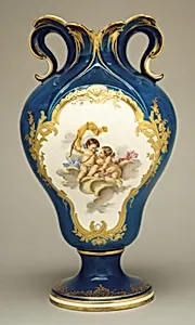 This exquisite *Vase (vase à oreilles)*, one of a pair from 1758, exemplifies the pinnacle of French porcelain at the renowned Sèvres Manufactory.ed in soft-paste porcelain—a, early formula prized for its creamy translucency and ability to capture intricate modeling—this 12⅛-inch (30.8 cm) vessel modeled by the innovative sculptor Jean-Claude Dupless and gilded by Antoine Cat. The "vase with ears" design features elegant handles, evoking the playful abundance of the Rococo style under Louis XV. Adorned with frolicsome putti—chubby, winged cherubs symbolizing love and joy—the vase bursts with ...