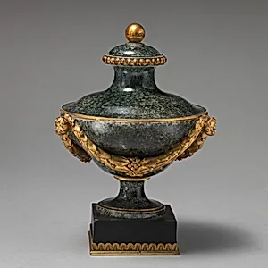 This elegant "Vase with Cover" from Wedgwood and Bentley crafted between 1769 and 1780, exemplifies the pinnacle of 18th-century British ceramics. Produced at Josiah Wedgwood's Etruria factory in Staffordshire,, it belongs to the firm's celebrated Porphyry ware—a luxurious stoneware that mimicked the prized ancient stone porphyry, known for its rich purple hue and sparkling flecks. Using finely ground red and white clays, Wedgwood achieved a marbled, gem-like surface through pioneering techniques like pressure-molding and slow bisque firing, revolutionizing mass-produced luxury goods. Histori...