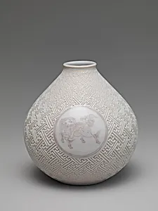 紫馬麒麟卍紗綾形紋瓶 (一対)|Vase with Horse and Kirin on Geometric Sayagata (key fret) Pattern (one of a pair)