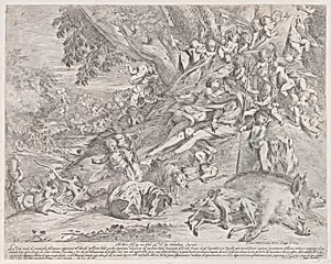 Venus and Adonis, surrounded by many putti, reclining after the hunt, with a dead boar in the lower right