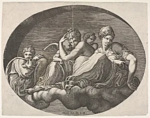 Venus and Cupid and two other goddesses seated on a cloud under an arch and accompanied by a putto, an oval composition, from a series of eight compositions after Francesco Primaticcio's designs for the ceiling of the Ulysses Gallery (destroyed 1738-39) at Fontainebleau