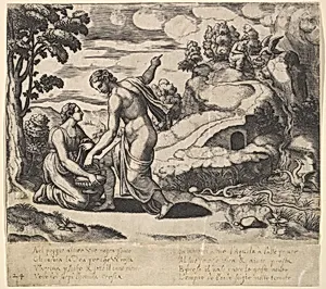 Venus ordering Psyche to take water from a fountain guarded by dragons, from "Fable of Cupid and Psyche"