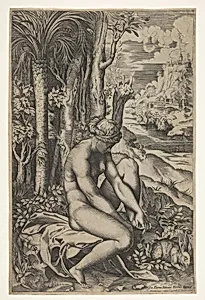 Venus removing a thorn from her left foot while seated on a cloth beside trees and foliage, a hare eating grass before her