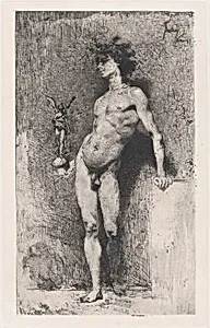 Victory: a naked youth standing facing left holding a statue of winged Victory in his right hand