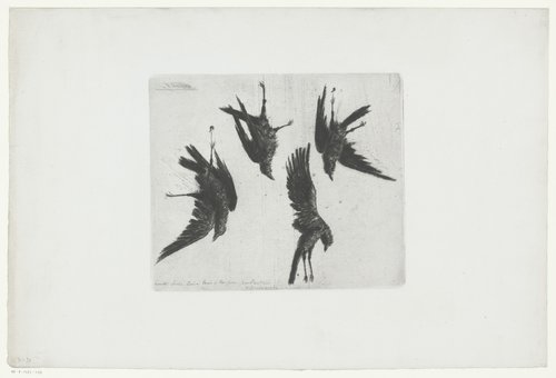 Vier dode kraaien hangend aan een muur