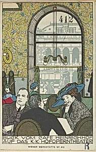 Step into the bustling café culture of imperial Vienna with Gustav Kalhammer's *View from Café Heinrichhof the Imperial and Royal Court Theater* (1911 a vibrant color lithograph by the innovative Wiener Werkstätte collective. From the cozy interior of Café Heinrichhof, the print gazes outward to the grand K.K. Hofoperntheater—today's Vienna State Opera—capturing elegant patrons, both men and women, amid the swirl of everyday elegance on the eve of World War I. Wiener cafés like Heinrichhof were vibrant social hubs in the Habsburg capital, where intellectuals, artists, and opera lovers gathere...