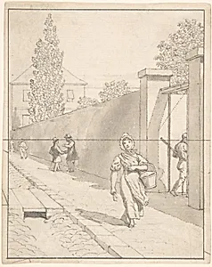 Pen and gray ink, gray wash, and graphite; an incised construction line at lower left