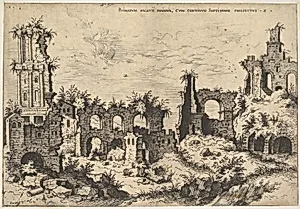View of ruins on the Palatine Hill with trabeated facade at left and arcades at center, from the series 'The Ruins of Rome' (Praecipua aliquot Romanae antiquitatis ruinarum monimenta, vivis prospectibus)