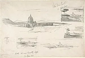 Edward Lear's *View of St. Peter's Rome* (1843) captures the majestic dome of one of the world's most iconic landmarks in a precise graphite drawing. Created during Lear's extensive travels through Italy from 1842 to 184, this work reflects the British artist's passion for topographical sketching. Known today for his whimsical nonsense poetry like *The Owl and the Pussycat*, Lear was also a skilled illustrator whose detailed landscapes served as visual records in an era before photography dominated travel documentation. Rendered on a modest sheet measuring 9 11/16 x 14 1/2 inches, the drawing...