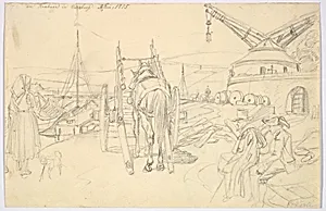 View of the Alter Kranen in Würzburg; verso: Study of Three Soldiers and Two More Figures