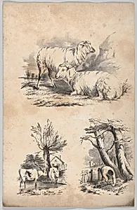 Vignette with two sheep, Vignette with two cows in a pool, and Vignette of a wood-gatherer, in: The New York Drawing Book, Containing a Series of Original Designs and Sketches of American Scenery, No. 2