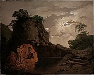 Joseph Wright of Derby's *Virgil's Tomb bylight, with Siliusicus Declaiming* (9) captures a poignant nocturnal scene at the ancient tomb of the Roman poet Virgil Naples, Italy. In this oil on canvas (40 x 50 in.), Wright depicts the Roman poet Silius Italicus, devoted admirer of Virgil, passionately reciting verse amid the moonlit ruins. Painted during the height of the Grand Tour era, when British aristocrats traveled to Italy for classical inspiration, the work reflects 18th-century Romantic fascination with antiquity, ruins, and the sublime power of moonlight. Wright, a pioneering English ...