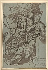 Paolo Farinati (1524–1606), a Veronese artist of the late Renaissance, crafted this intimate drawing of the *Virgin and Child with Saint John the and Saint Paul* using pen and brown ink, brush and wash over traces of black chalk on prepared paper. This devotional scene captures a tender moment in sacred iconography: the Madonna cradling the Child, flanked by the young Saint John the Baptist—often symbolized with a lamb—and the scholarly Saint Paul. Farinati's work reflects the Mannerist tendencies of his Veronese circle, blending Venetian coloristic warmth with precise draftsmanship. The blue...