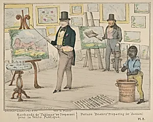 Alfred E. Baker's *Vive la France,ands de "Tableaux se Préparant pour la Ventelique / Picture "Deal" Preparing for "Auction (1840) is a hand-colored lithograph that captures the bustling chaos of the 19th-century art market with sharp wit. Created as a satirical print, it depicts merchants—likely French auctioneers, given the ironic "Vive la France" cry—frantically preparing paintings for public sale. The scene teems with boys, men and female nudes, poking fun at the trade's underbelly, where artworks (and their often risqué subjects) are handled like commodities. Lithography, a revolutionary...