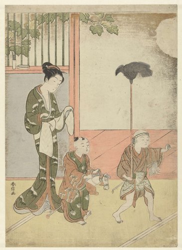 Vrouw in kimono met patroon van besneeuwde bamboe, kijkend naar twee jongetjes die een daimyo stoet naspelen. Voorop een jongetje met in zijn rechter hand een bezem als speer en tussen zijn riem een stoffer als zwaard, gevolgd door een jongetje op een stokpaard.