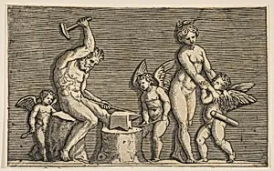 Vulcan seated hammering on an anvil flanked by Venus and three cupids