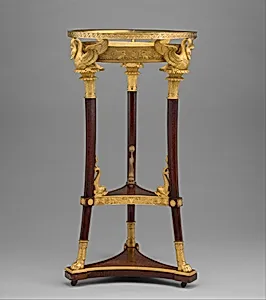 Legs, base and shelf of yew wood; gilt-bronze mounts; iron plate beneath shelf