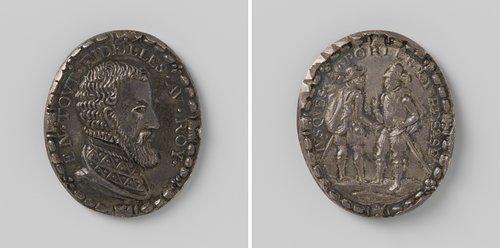 Nestled among treasures of the Dutch Golden Age, *Watergeuzen* is a diminutive bronze cast by Flemish sculptor and medallist Jacques Jonghelinck (c. 1535–1606). Dated between 1600 and 1699, this petite artwork measures just 3.8 cm long, 3.2 cm wide, and weighs .83 grams—perfect sized for a collector's medal or pocket token. Jonghelinck, brother to renowned sculptor Hans Jonghelinck, was celebrated for his intricate portrait medals and allegorical bronzes, often cast using the lost-wax technique to capture fine details in miniature form. The title *Watergeuzen* evokes the heroic "Sea Beggars,"...