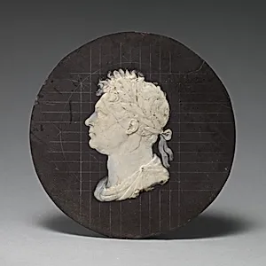 This delicate wax model, created by Italian-born engraver Benedetto Pistrucci in 1820, served as a preparatory portrait of King George IV, who ascended the British throne that very year. Measuring just over 4 inches in diameter it captures the monarch's profile in intricate detail on a slate base, exemplifying the precision of wax modeling—a favored technique among 19th-century medalists for designing coins, plaquettes, and cameos before metal casting. Pistrucci, renowned for his work at the Royal Mint including the iconic St. George and the Dragon reverse on British sovereigns, brought neocla...