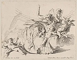 Wealth, represented by a woman seated on clouds and surrounded by putti, one of whom is pouring coins