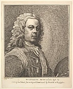 This etching, titled *William Hogarth, Self-portrait captures the likeness of the renowned 18th-century English William Hogarth (1697–1764), likely reproduced by engraver Samuel Ireland in 1785. Printed on a modest sheet measuring 9 5/16 x 7 9/16 inches, it exemplifies the precision of etching—a technique where acid etches lines into a metal plate for intricate, reproducible prints. Housed in the Metropolitan Museum of Art's Drawings and Prints department, it entered the collection via the Harris Brisbane Dick Fund 1917. Hogarth, a pioneer of satirical art, revolutionized British visual cultu...