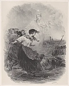 In the mid-19th century, artists like Célestin Nante (1813–1873), a skilled lithographer known for his delicate landscapes and figurative scenes, captured the poetic interplay of human emotion and nature. This lithograph, *Woman by the Sea with the Madonna, Pointing to Ship* (ca. 1848–62), printed in Paris by Bertauts and P. Cadet, evokes a moment of quiet drama along the shoreline. A woman stands with the protective figure of the Madonna, her gesture directing attention to a distant ship—perhaps symbolizing departure, longing, or divine safeguarding during an era of maritime exploration and p...